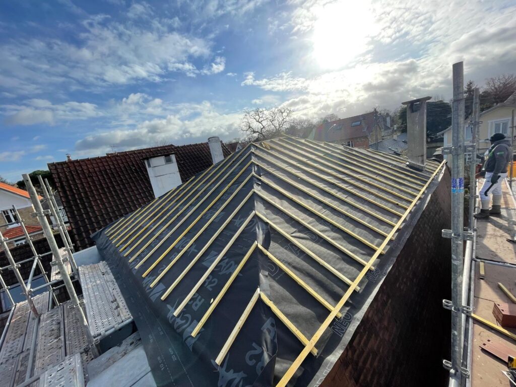 Nous retirons l’ancienne couverture, vérifions et renforçons la charpente si nécessaire, posons un écran sous-toiture pour assurer une parfaite étanchéité, améliorons l’isolation si besoin, puis installons la nouvelle couverture avec des finitions soignées (faîtage, rives, solins et zinguerie) afin de garantir une toiture solide, durable et parfaitement protégée contre les intempéries.